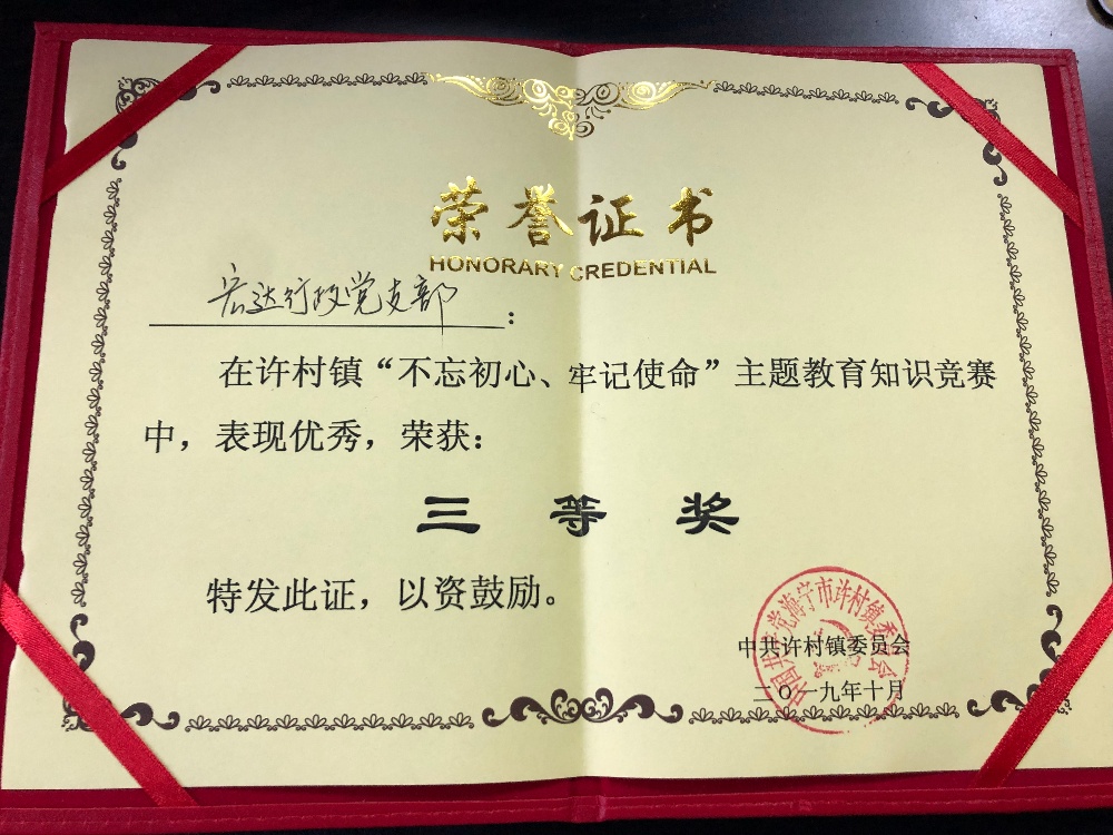 為引導(dǎo)廣大黨員干部更加全面、準(zhǔn)確、深入地學(xué)習(xí)貫徹“不忘初心、牢記使命”主題教育會議精神,進(jìn)一步深化學(xué)習(xí)教育,2019年10月25日,“不忘初心、牢記使命”主題教育知識競賽決賽在許村鎮(zhèn)八樓會議室舉行,宏達(dá)行政黨支部代表隊在初賽中脫穎而出,與其他七支村、企事業(yè)單位隊伍進(jìn)行角逐。