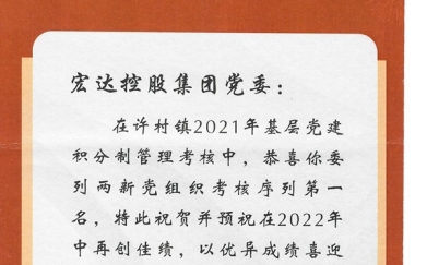 宏達(dá)控股集團黨委在許村鎮(zhèn)2021年基層黨建積分制管理考核中,委列兩新黨組..